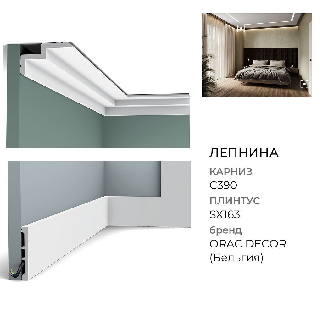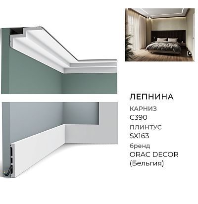 Профиль строгого дизайна из серии Steps. C390 прекрасно послужит как оригинальный модернистский карниз или как практичный способ скрыть направляющие рейки штор или светодиодный светильник. Кроме того, скошенный угол на верхней и нижней кромке создает легкую затененную линию, еще более подчеркивая игру света и тени.